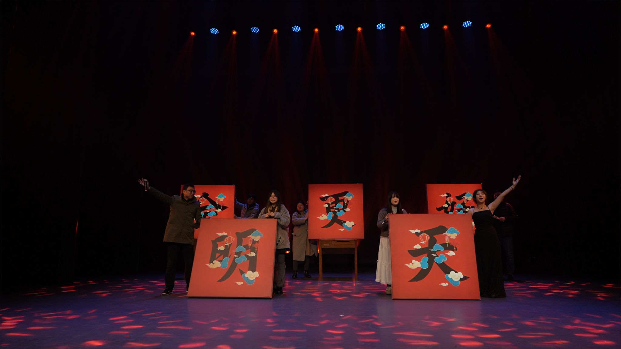 第三篇章《绘梦未来 马到成功》由配音五侠声演《Tough Love》开启,节目让声音戏剧直击心灵,呼吸、哽咽、怒吼皆入麦,全场只听声波却“看见”剧情;音乐系短剧《未来“是”》折叠时间,叩问青春未来式;美术学系现场挥毫+音乐《明天会更好》,奉献视听双重盛宴;设计学子爆笑小品《万松书院》以现代幽默对话古代书院,古人“之乎者也”撞上今人口语梗,青松墨韵里爆出阵阵笑声;林啸老师领衔2023级舞蹈女班压轴上演《峡江吟》,刚柔并济的肢体语言对话巴山渝水,裙裾似江雾翻涌,背脊如峰峦起伏,为晚会写下余韵悠长的艺术句号。