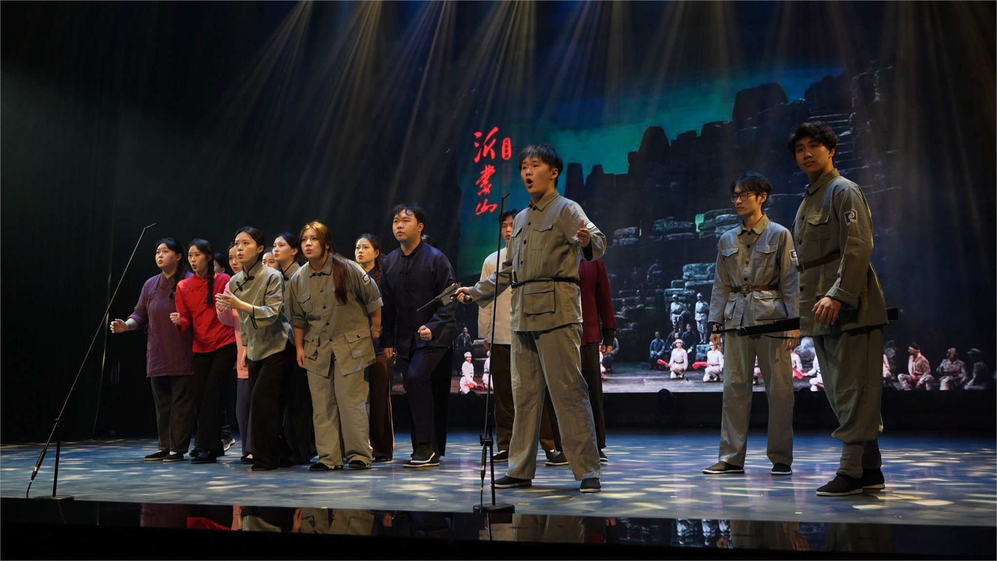 行政管理老师们暖心献唱《相亲相爱一家人》,平日严谨的老师走下办公桌,用略带羞涩却真挚的和声让“家文化”沁润人心;音乐系《童年时光机》以纸飞机与蝉鸣唤醒纯真年代,旧课本、玻璃弹珠、傍晚的稻香统统乘旋律而来;舞蹈系2022级男生《山·行》将巴渝山川搬上舞台,足尖踏出青石板梯,背脊拱成绝壁峰线,写意流动山水,也写少年“会当凌绝顶”的倔强。